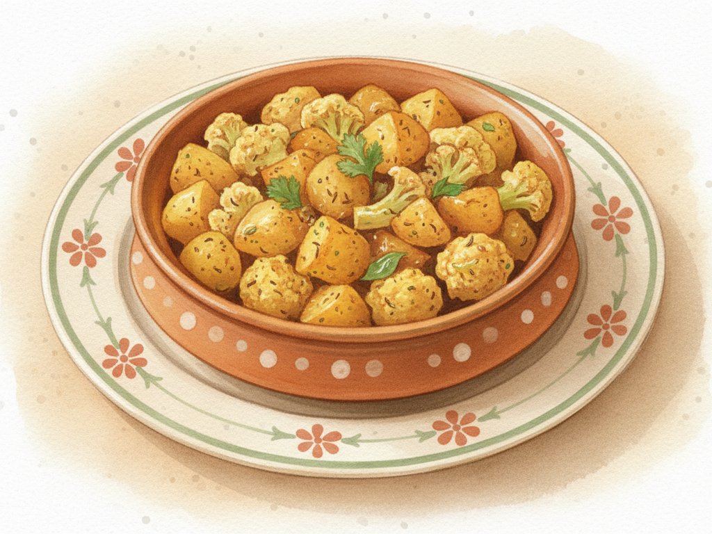 A classic North Indian dry or semi-dry curry of potatoes and cauliflower cooked with turmeric, cumin, and spices. A comforting vegetarian staple on restaurant menus across India.