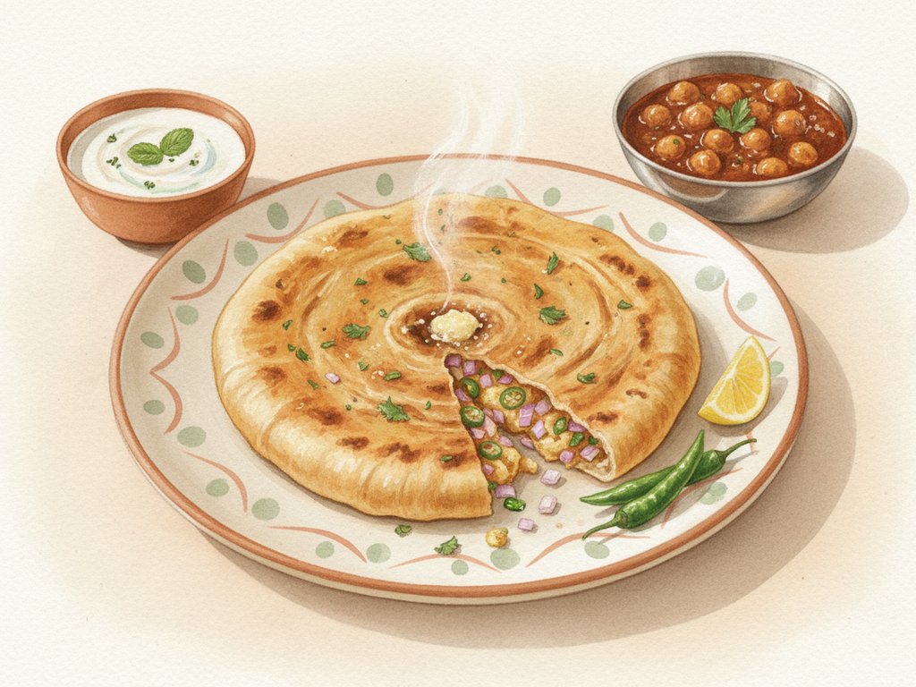 A tandoor-baked stuffed flatbread from Amritsar filled with spiced potatoes, onions, and cottage cheese. Thin, crispy, and smeared with ghee, a staple street food.
