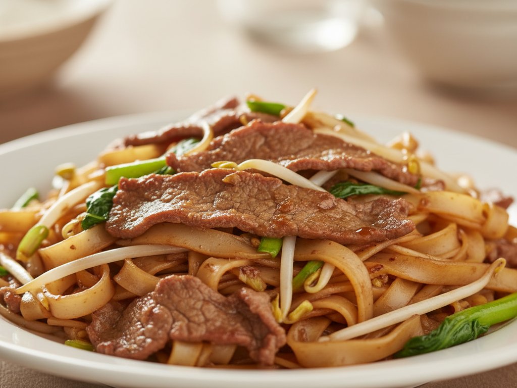 A Cantonese stir-fry of wide flat rice noodles with marinated beef and bean sprouts, prized for its smoky wok hei flavor from high-heat cooking.