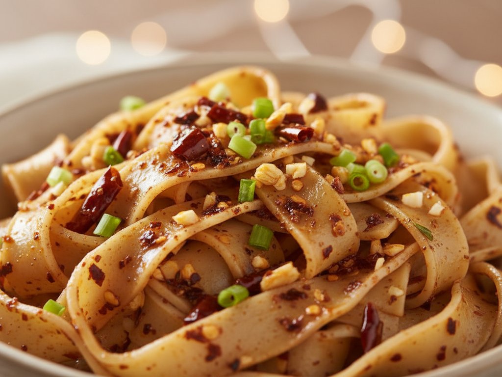 Extra-wide, belt-like hand-pulled wheat noodles from Shaanxi province, topped with chili flakes, garlic, and scallions with sizzling hot oil poured over them.