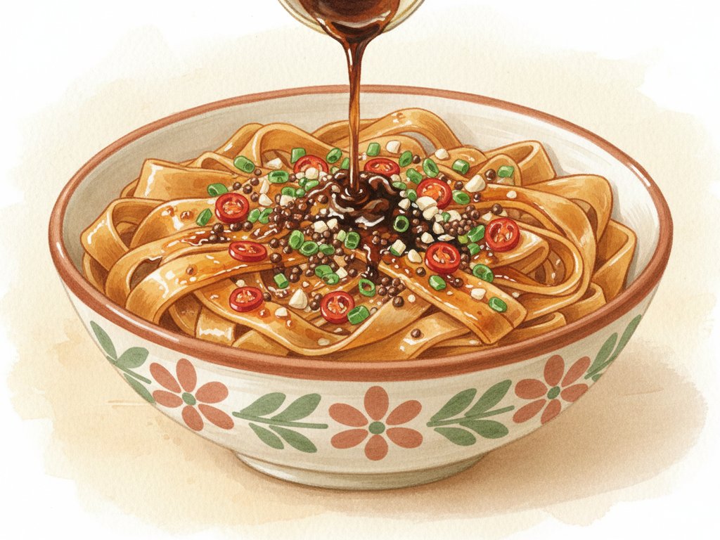 Extra-wide, belt-like hand-pulled wheat noodles from Shaanxi province, topped with chili flakes, garlic, and scallions with sizzling hot oil poured over them.