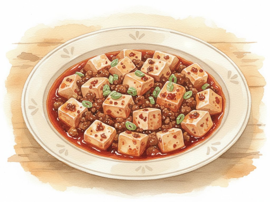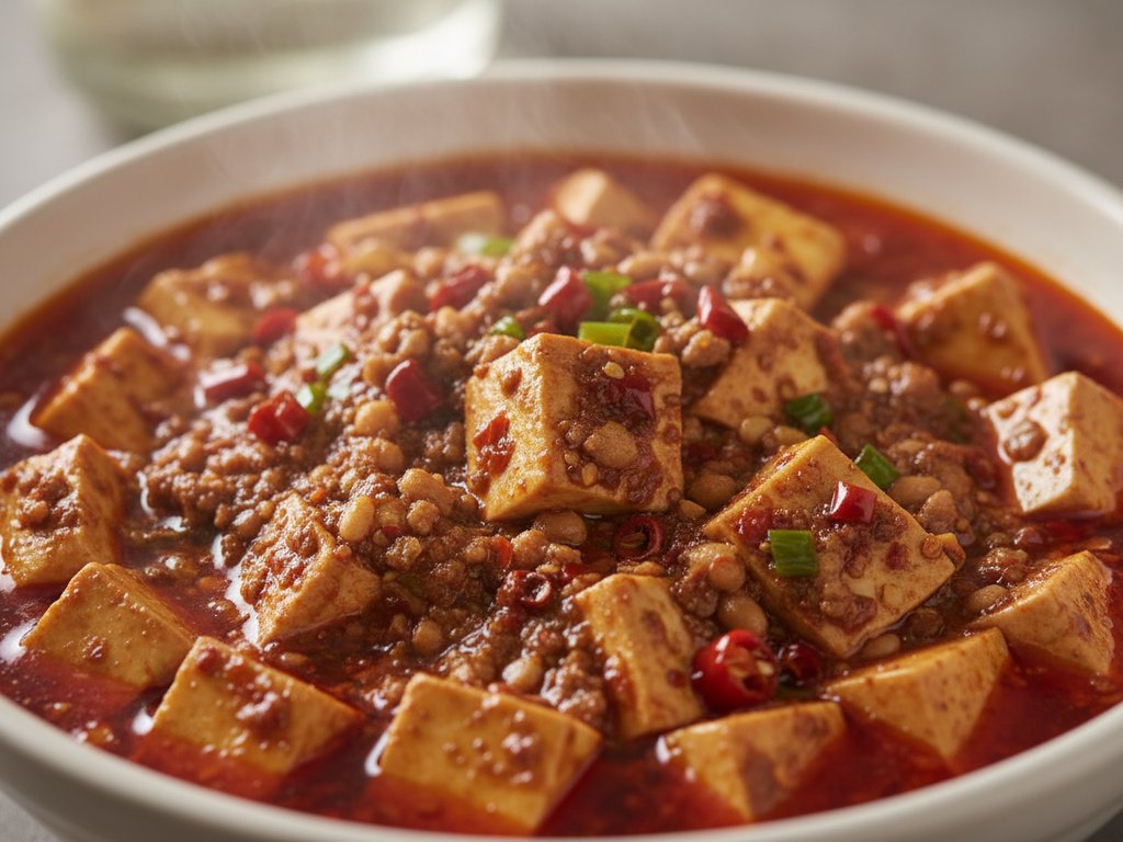A signature Sichuan dish of soft tofu cubes simmered in a fiery red sauce of doubanjiang, chili oil, Sichuan peppercorns, and ground pork, delivering numbing heat.