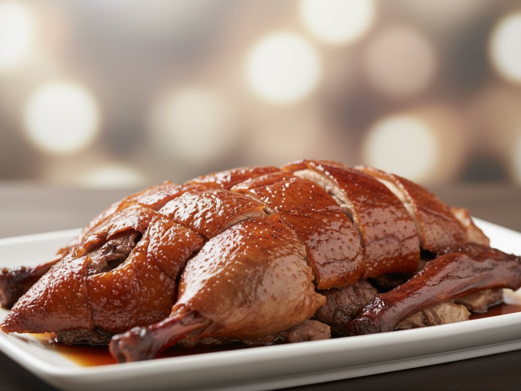 A prized Cantonese siu mei dish of whole goose roasted until the skin is burnished and crispy, served chopped with plum sauce.