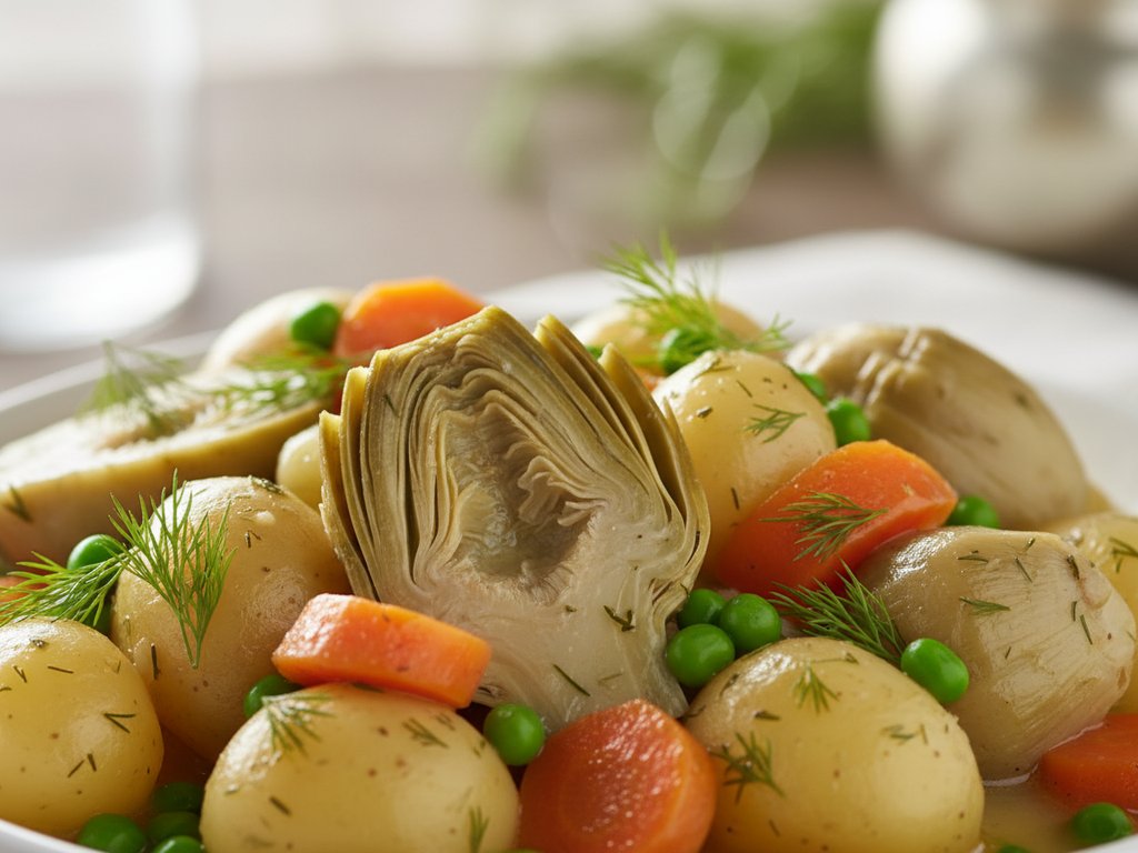 A delicate vegetable stew of artichokes braised with potatoes, carrots, peas, dill, and lemon juice. Named after Constantinople (the 'City'), this dish is traditionally prepared during Lent and Easter.