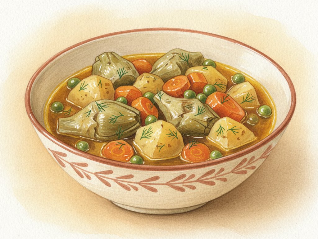A delicate vegetable stew of artichokes braised with potatoes, carrots, peas, dill, and lemon juice. Named after Constantinople (the 'City'), this dish is traditionally prepared during Lent and Easter.