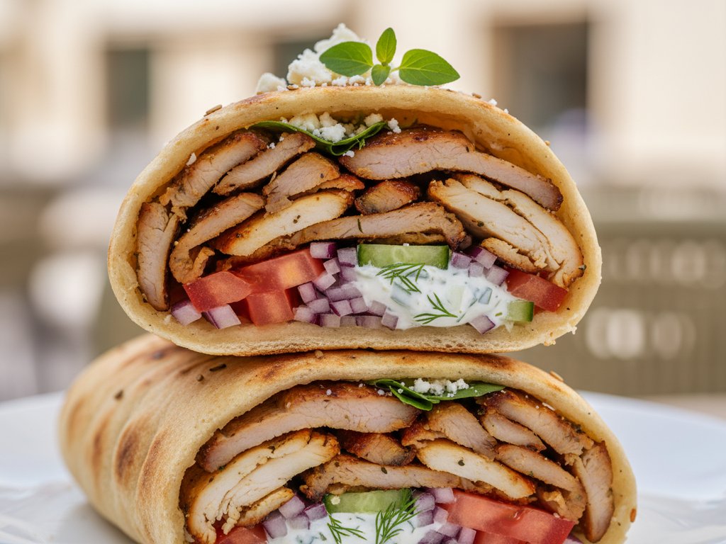 Thinly sliced meat (typically pork or chicken) cooked on a vertical rotisserie, served wrapped in pita bread with tomatoes, onions, and tzatziki sauce. Greece's most popular street food.