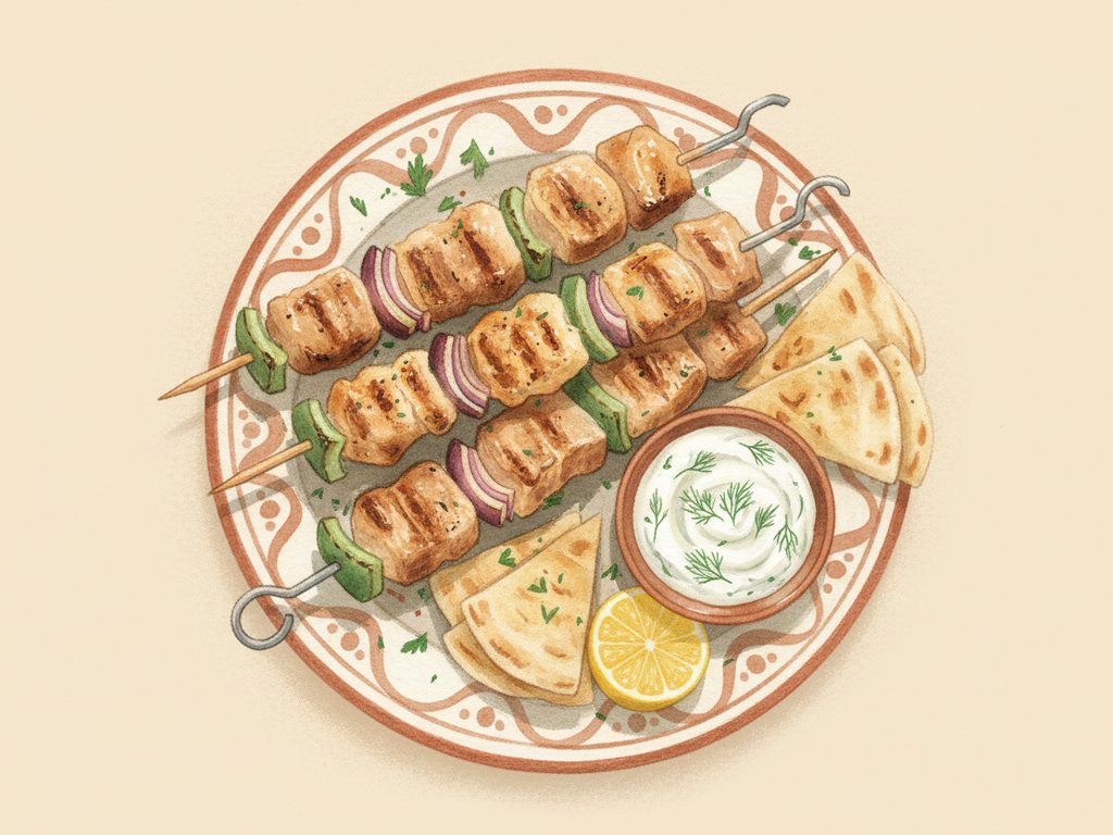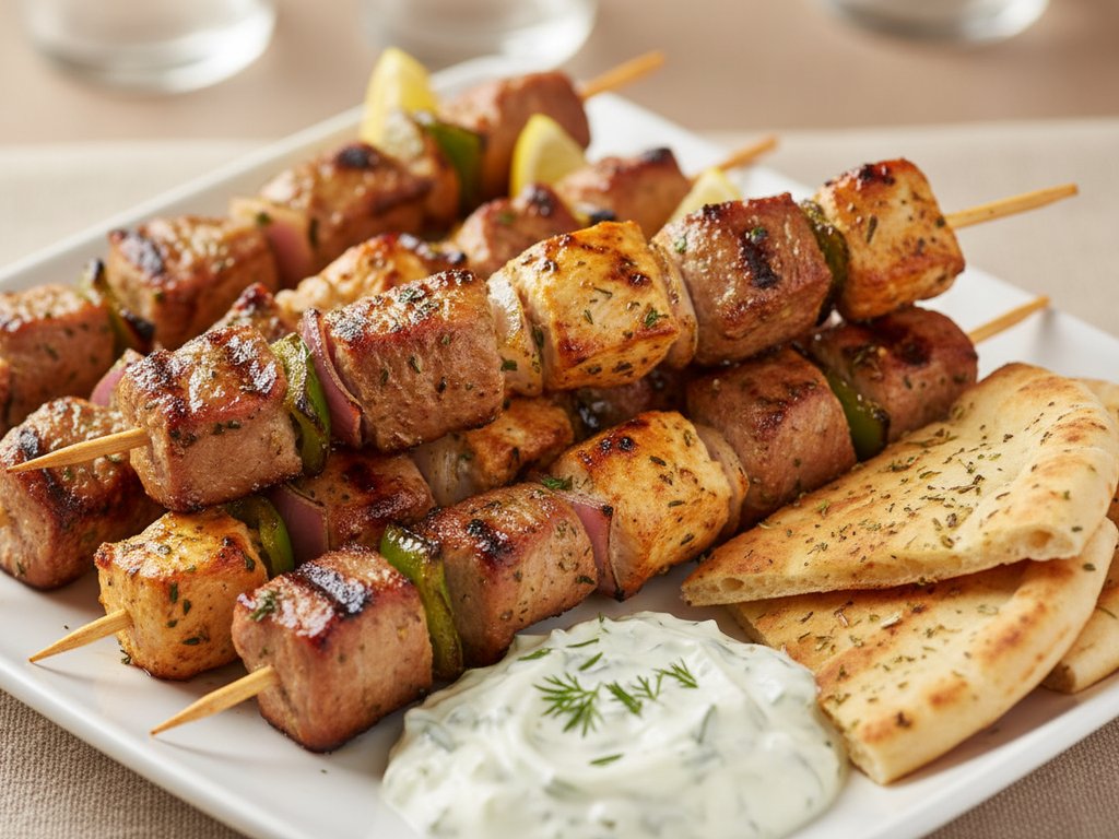 Small cubes of marinated and grilled meat on skewers, typically pork, chicken, or lamb. Served on skewers or wrapped in pita with garnishes. A staple Greek street food dating to antiquity.