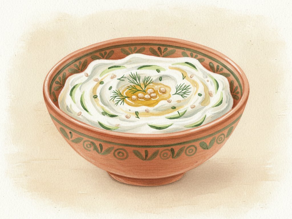 A creamy dip made from thick strained yogurt, grated cucumber, garlic, olive oil, and dill or mint. Ubiquitous as a dip, sauce, or accompaniment throughout Greek cuisine.