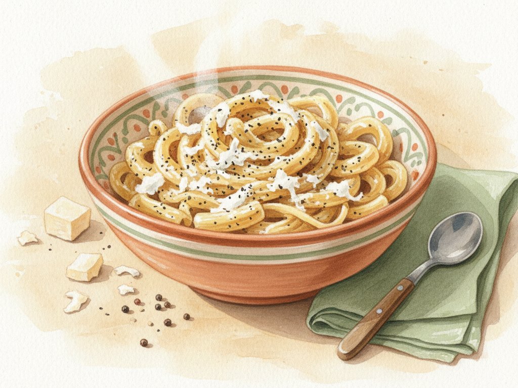 A Roman pasta dressed with Pecorino Romano and black pepper, emulsified with pasta water for a creamy texture.