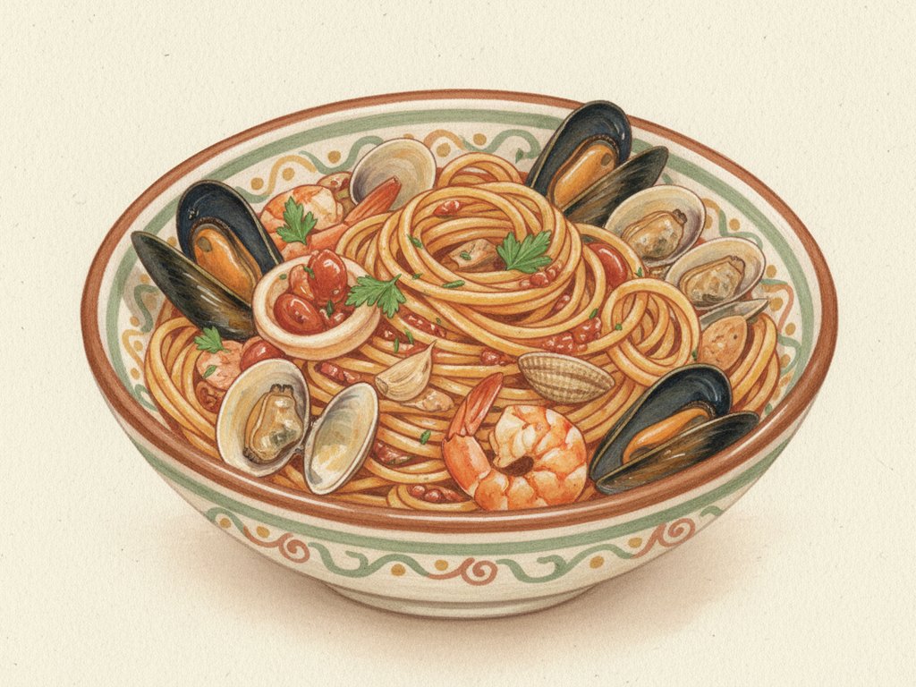 A coastal Italian pasta served with mixed seafood, often in a garlicky tomato or white-wine sauce.