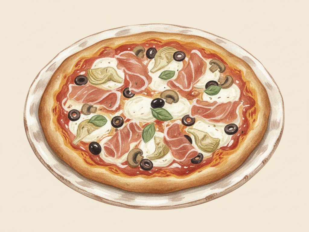 A classic Italian pizza commonly topped with tomato, mozzarella, and a mix such as mushrooms, artichokes, and ham.