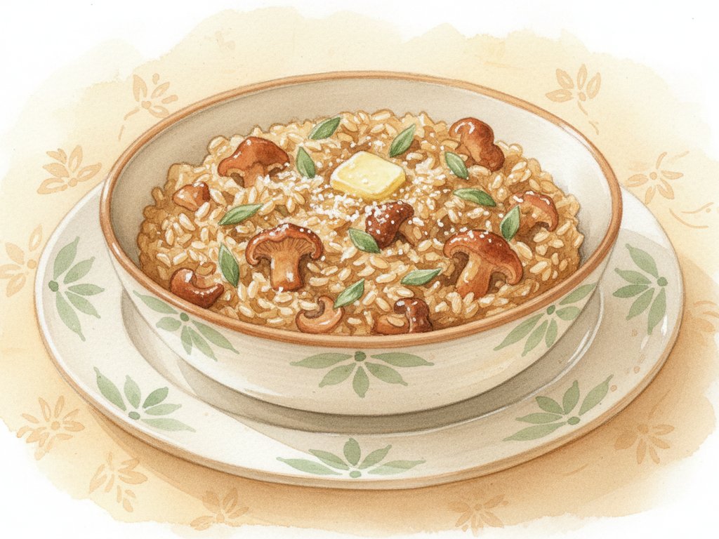 A creamy Italian risotto flavored with porcini mushrooms and typically finished with butter and cheese.