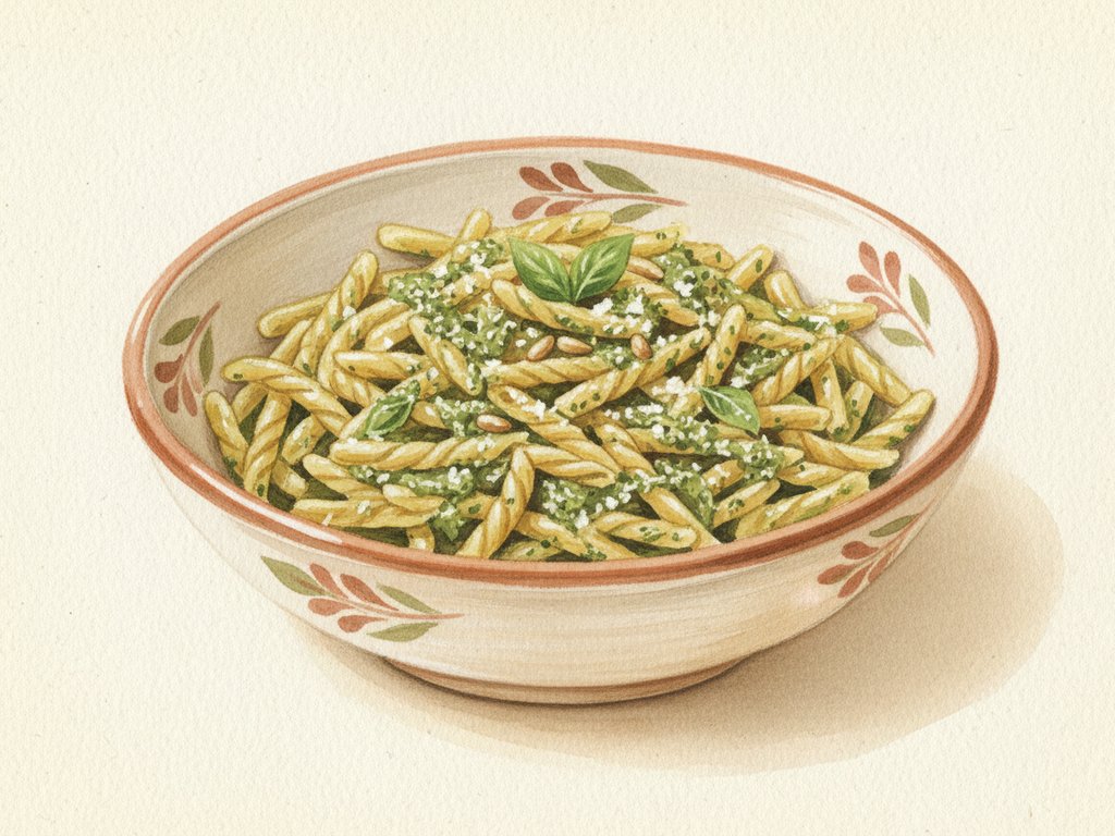 A Ligurian pasta dish featuring short twisted trofie tossed with basil pesto.