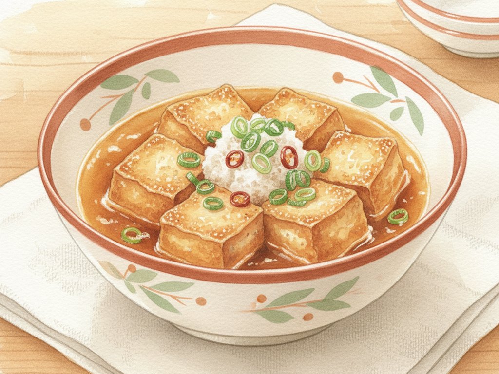 Lightly coated tofu deep-fried until crispy, served in a warm dashi-soy broth and topped with grated daikon, ginger, and bonito flakes. A popular appetizer at izakaya and traditional restaurants.