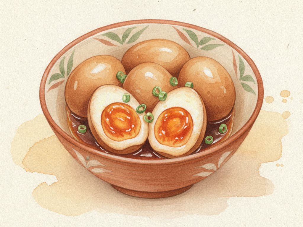 Soft-boiled eggs marinated in a soy sauce and mirin mixture until the egg whites turn amber and the yolks become custard-like. The most popular ramen topping, also enjoyed as a snack or bento item.