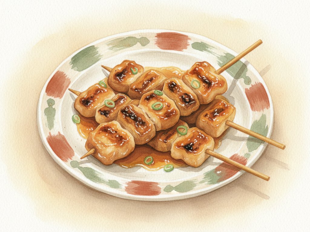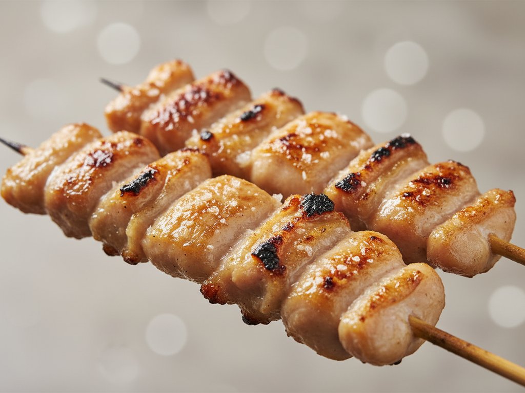 Skewered and grilled chicken pieces, a staple of Japanese izakaya culture. Seasoned either with salt (shio) or glazed with a sweet soy-based tare sauce. Various cuts of chicken are used, from thigh to skin to cartilage.