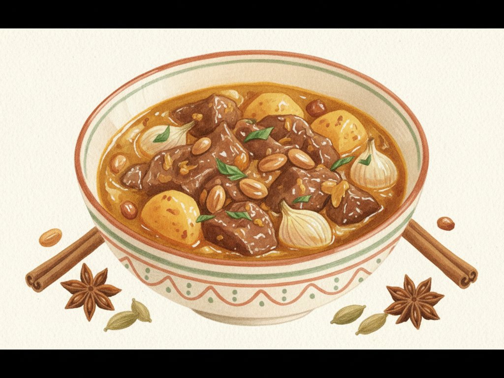 A mild, sweet Thai curry with Middle Eastern and Indian influences, combining coconut milk, meat, potatoes, and roasted peanuts. The paste features roasted spices like cinnamon, cardamom, cumin, and cloves.