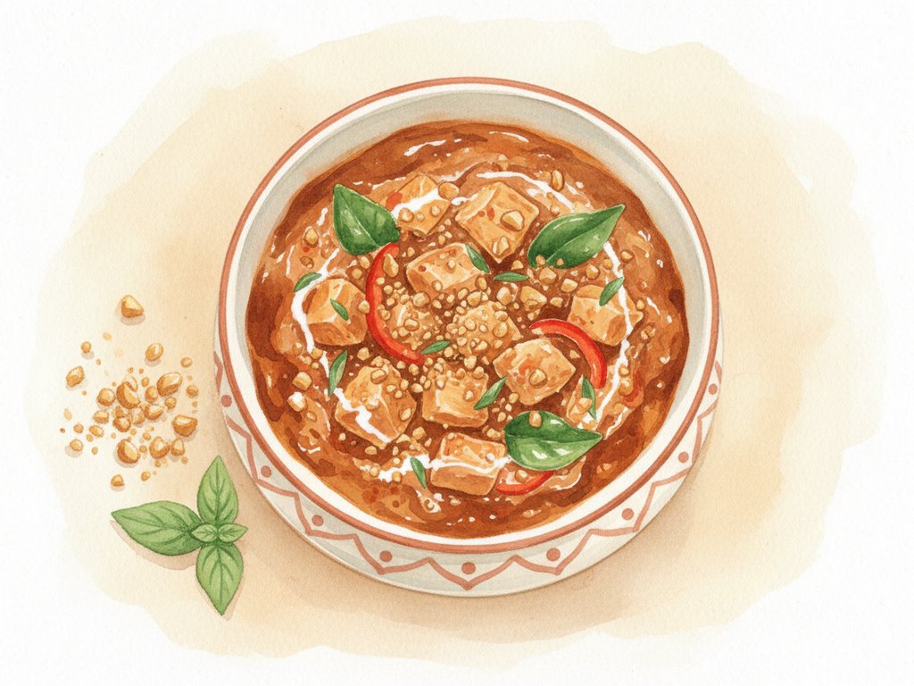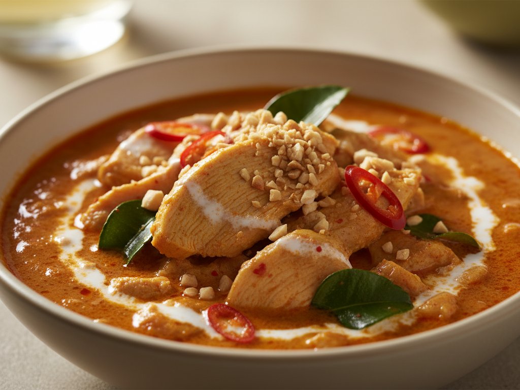 A rich, thick Thai curry with a distinctive salty-sweet peanut flavor. Made with coconut milk, panang curry paste, and makrut lime leaves, it is traditionally served with beef, chicken, duck, or pork without vegetables.